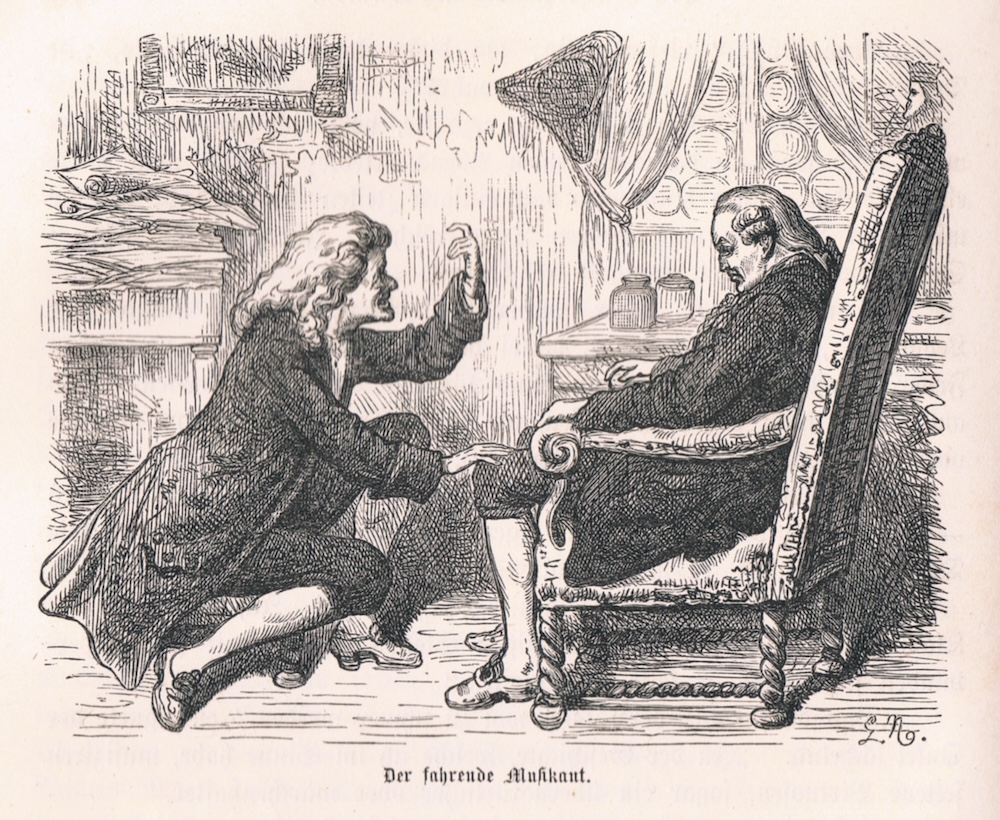 „Weil es also ist,“ entgegnete der Musiker etwas verletzt, „so muss ich die Zeit gebrauchen. Und gerade jetzt habe ich eine Komposition zu vollenden, die am nächsten Sonntag executirt werden soll. Deshalb fasst Euch kurz; oder noch besser, verschiebt Euer Anliegen bis morgen.“
