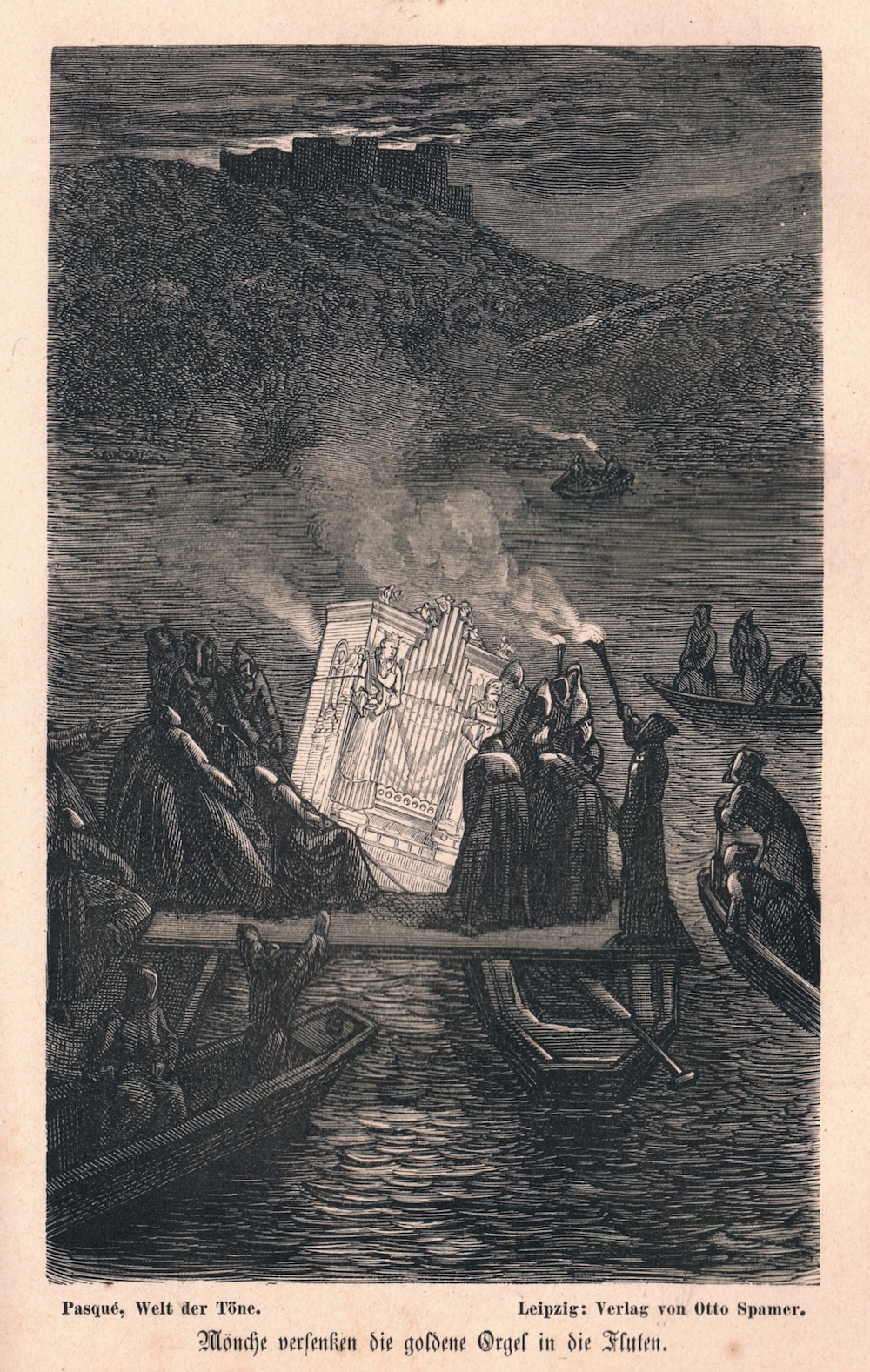 Doch Ruhe fand der Unglückselige nicht, eben so wenig wie sein goldenes Pfeifenwerk. Alle sieben Jahre, in gleicher Nacht und zu gleicher Stunde, taucht die goldene Orgel aus dem Wasser auf, und der Mönch sitzt daran und spielt wundersame Melodien, die geisterhaft durch Tal und Wald tönen, bald leise klagend, bald lieblich klingend, also dass Mancher es gehört und schier geglaubt, es sei eine Musik der lieben Englein im Himmel droben. Zur selben Zeit nun darf Jeder, der es versteht und sich dazu unterfängt, sich an die Stelle des gespenstischen Mönches setzen und das goldene Werk spielen. Wird er ihm dann gerecht, spielt er also tüchtig und vortrefflich, dass der Mönch ihn als seinen Meister anerkennt, so darf er weiter und als Lohn einen Teil der Orgel zu Eigen verlangen. Doch wenn er unterliegt, den gespenstischen Meister in seinem Spielen nicht überbietet und übertrifft, so verschwinden Orgel und Mönch und der Letzterer wagt Leib und Leben. Also kündete die alte Handschrift.“